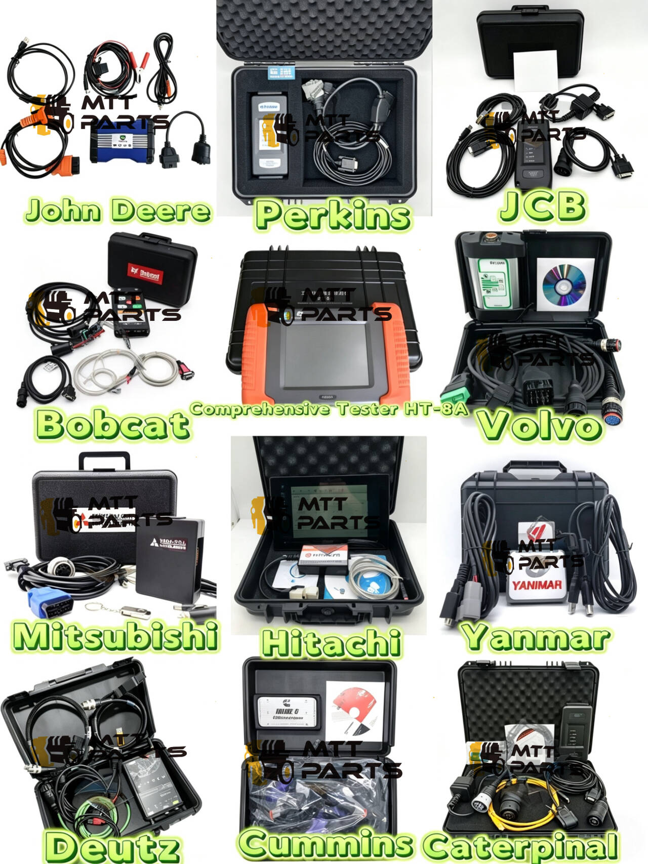सबसे बड़ी बात यह है कि वे कितने व्यावहारिक दिखते हैं। कोई सामान्य उपकरण नहीं जो आधा-अधूरा काम कर सके; ये ब्रांड-विशिष्ट सेटअप हैं जो ठीक से कनेक्ट होते हैं और आपको वह डेटा देते हैं जिसकी आपको वास्तव में आवश्यकता होती है। यहां तक कि बीच में एक व्यापक ऑल-इन-वन टेस्टर (HT-8A) भी दिखाया गया है, साथ ही यानमार या बॉबकैट जैसे ब्रांडों के लिए विकल्प भी हैं जिनके लिए अच्छे डायग्नोस्टिक्स ढूंढना थोड़ा कठिन है।